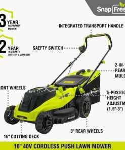 SnapFresh Electric Lawn Mower Cordless – 40V (2 x 20V) 16” Brushless Push Lawn Mower with 4.0Ah Battery x 2 and Fast Charger Included – Battery Operated Lawn Mower with Bagger